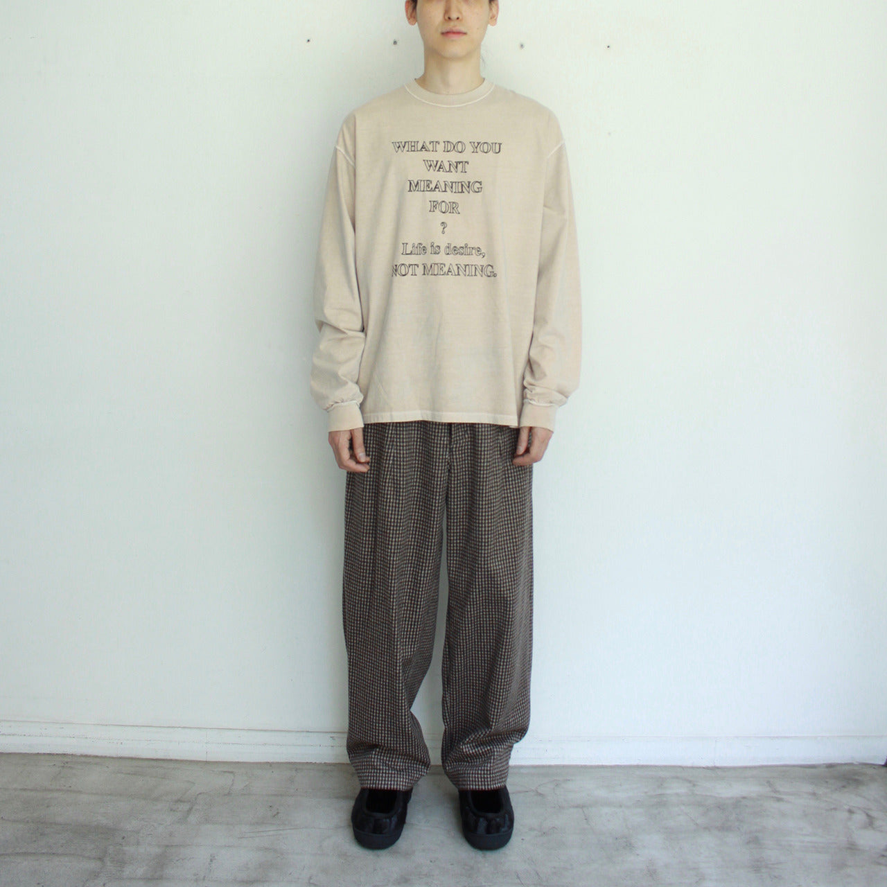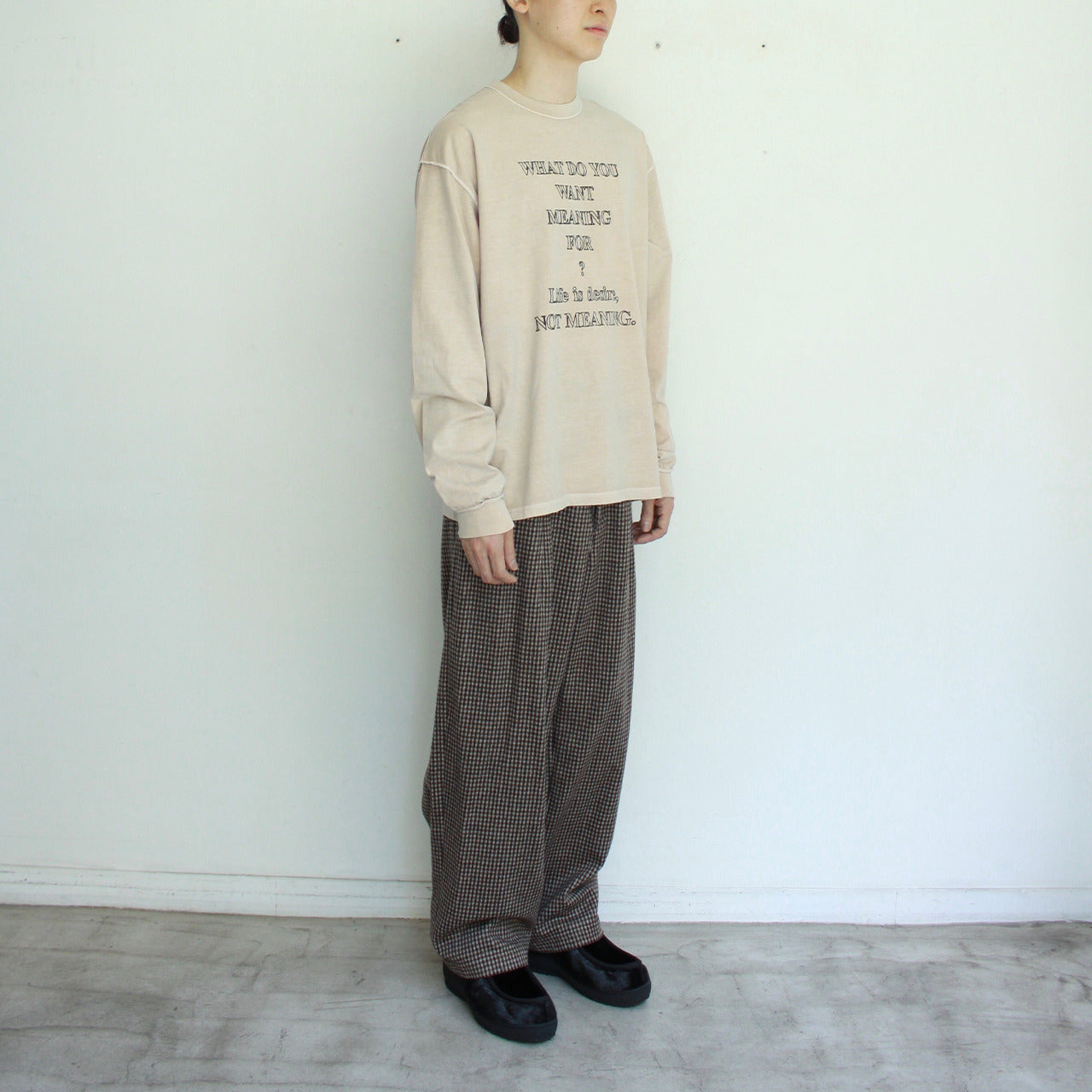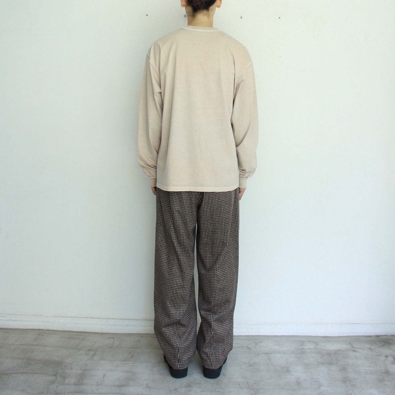 フロントと裾にダーツが入った特徴的なディテールのバギーパンツは、裾にダーツを入れる事でテーパードしたシルエットを構築し、太さがありながら、上品なシルエットに仕上げています。ベルトループを完備しながらも、後ベルトにはゴムを配したイージー仕様でベルトレスでも着用出来ます。リサイクルウールのガンクラブチェックは、厚みのある肉感としっかりとした保温性を備え、膨らみのある素材です。
